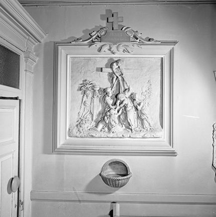 Katolska kyrkan. Ovanför en vigvattenskål sitter en relief föreställande Jesu nedtagning från korset, den så kallade Korsnedtagningen