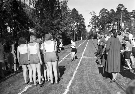 Tomteboda blindinstituts idrottstävlingar. Syster Gustafsson bromsar in vid mållinjen av sitt 60-meters lopp