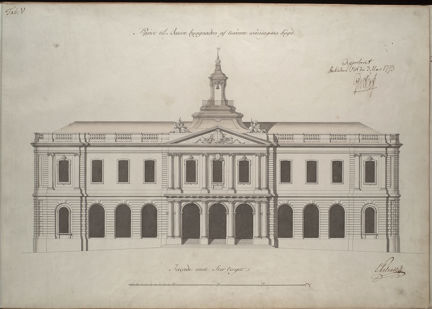 Ritningen godkänd av Gustav III genom namnteckning i övre högra hörnet.