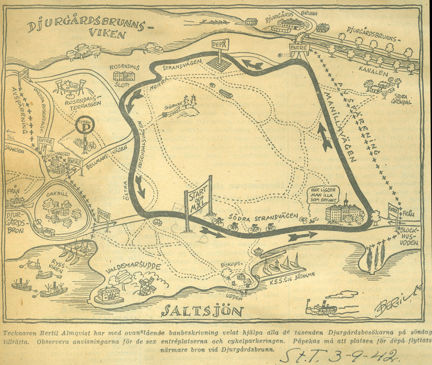 Teckning av Bertil Almqvist ur Stockholmstidningen den 3 september 1942. Djurgårdsloppet genomfördes under Barnens dag på Djurgården den 6 september.