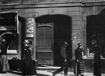 Några personer passerar porten till Hornsgatan 10. I huset finns kapp och klädessömmerska, fru S. Sundkvist
