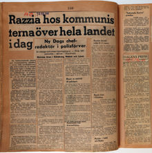 Liknande repliker hörde man många, och de verkade på iakttagaren ganska upprörande när man väl fick se vad som förehafts och vad som kunnat hända. Ett samtal med de övermannade unga fascisterna - själva förnekade de att de tillhörde någon som helst organisation, men det framgick av åtskilliga saker att ynglingarna voro fullständigt Hitler-bitna - stärkte ytterligare den tanken att Stockholm inte längre är så lugnt som man kan tro. Det rör sig åtskilligt i unga, överspända hjärnor, och de nationalsocialistiska elementen ha starkt påverkats av både Lappos skjutsar och andra av ledarna glorifierade övergrepp i utlandet. Apropå Lappo, så talades det under upprorskvällen på Ny Dag mycket om att ynglingarnas avsikt varit att enlevera hr Sillén. För inte så länge sedan var tidningens ekonomichef utsatt för en dylik historia, men skjutsen sträckte sig dess bättre inte längre än till Lilljansskogen.
