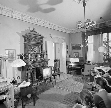 Några ungdomar tittar på TV. Bostaden som låg vid Artillerigatan 34 revs 1958