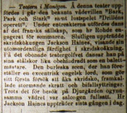 Notiser om skridskokungen Jackson Haines i Aftonbladet 1866