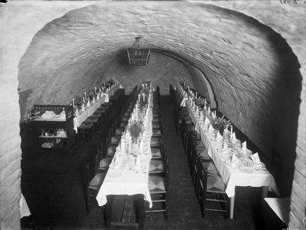 Restauranf Den Gyldene Freden, interiör med dukade bord i källaren