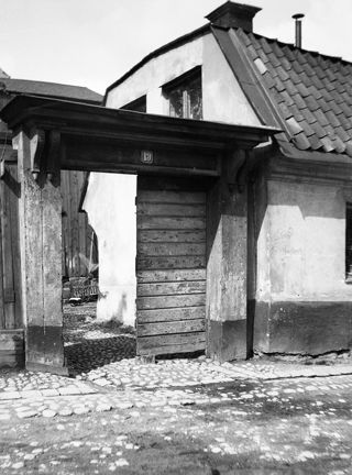 Port i planket mot kullerstensbelagda gården vid Lilla Bastugatan 19. Här ligger idag parken söder om Stadsbiblioteket vid Sveavägen