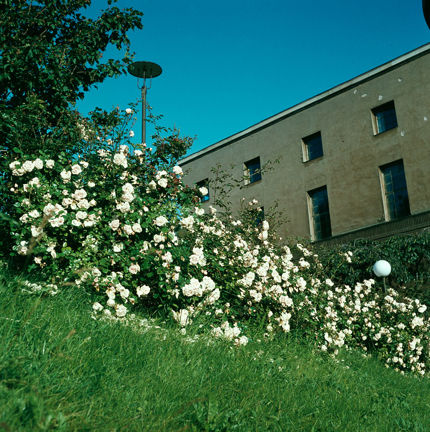 Observatorielunden mot Stadsbibliotekets södra fasad. Rosenbuskar ""New dawn""