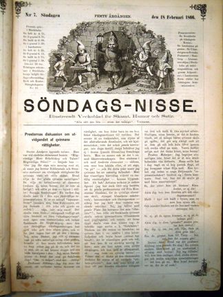 Under Riksdagen 1866 var frågan om kvinnors rättigheter ett hett ämne. Carl Fredrik Ridderstad och Carl Johan Svensén hade bland annat föreslagit att kvinnor skulle ges tillträde till universitetet. Här skämtar Söndags-Nisse om prästernas inställning i kvinnofrågan.