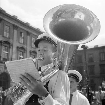 Uppvaktning utanför Stockholms slott på Gustav V:s 90-årsdag. En ung man blåser i en bastuba