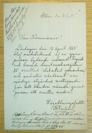 Lördagen den 18 april 1885 blef undertecknad af en qvinsperson lydande namnet Sigrid och boende Luntmakargatan 35 smittad /elakartad gonorrhea/ och anhåller vördsamt om nödiga åtgärders vidtagande för att hindra nämda qvinsperson att smitta andra.