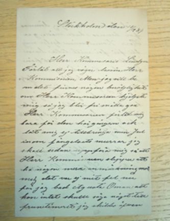 Förlåt att jag vågar besvära Herr Kommissarien, men jag vill be om det finnes någon möjlighet om Herr Kommisarien hjelpte mig så jag blir fri snälla goa Herr Kommisarien förlåt mig bara för den här gången ock låt mig ej tillbringa min Jul inom fängelsets murrar jag skall sedan uppföra mig så att Herr Kommisarien slippa att ha någon mera anmärkning mot mig det var ej mit fel nu för jag bad Agusta Öman att hon intet skulle säga något till fruntimret jag skildes äfven vid henne skall jag dömmas för hennes skull snälla goa Herr Kommisarien hjelp mig bli fri för mitt lilla barn skull som kommer utt från Barnhuset första dagarna i Januari och behöfer min hjelp