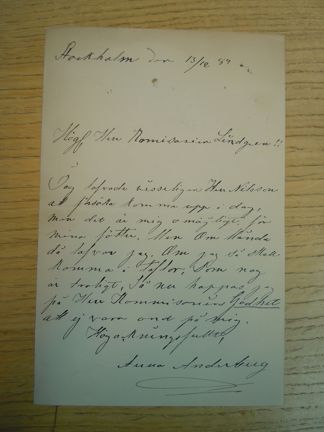 Jag lofvade visserligen Herr Nilsson att försöka komma upp i dag, men det är mig omöjligt för mina fötter. Men om Månda då lofvar jag, om jag så skall komma i tåflor, som nog är trokigt, så nu hoppas jag på Herr Kommisariens Godhet att ej vara ond på mig.