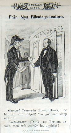 Skämt med anledning av att adelsmän – precis som alla andra riksdagsmän – måste bli valda för att få plats i Riksdagen, efter 1866 års representationsreform. En av de främsta motståndarna till representationsreformen var adelsmannen Henning Hamilton, som här nekas inträde till Riksdagen av Louis de Geer, som hade författat stora delar av den nya riksdagsordningen.