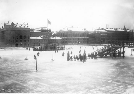 Förr i tiden fungerade Nybroviken som skridskobana och festlig mötespunkt för stockholmarna. Här har man byggt upp läktare och en tillfällig paviljong på isen. På paviljongen finns en skylt som utlovar musikafton. På isen blir det förmodligen uppträdande av skridskokonstnärer.