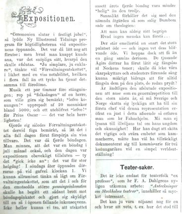 Expositionen. Krönika om Stockholmsutställningens avslutning i Söndags-Nisse – Illustreradt Veckoblad för Skämt, Humor och Satir, nr 42, den 14 oktober 1866