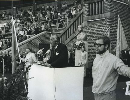 Stadion: Porträttbyst av Gustaf VI Adolf överlämnas i juli 1974