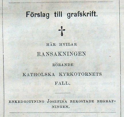Förslag till grafskrift. Här hvilar Ransakningen rörande Katholska kyrkotornets fall. Notis i <i>Söndags-Nisse – Illustreradt Veckoblad för Skämt, Humor och Satir</i>, nr 36, den 2 september 1866