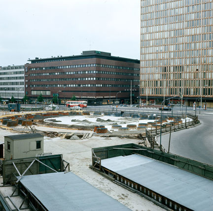 Anläggandet av fontänen vid Sergels Torg. Vy mot EPA och femte Hötorgshuset. Byggfutt i förgrunden