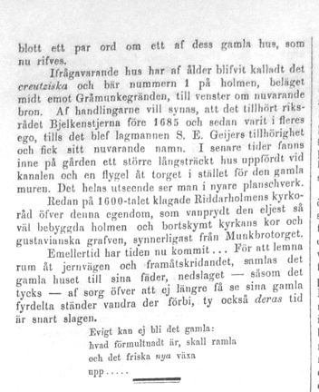 Geijerska huset eller Creutziska huset som det också kallats låg alldeles bredvid Riddarholmskyrkan. Här avbildat innan det skulle rivas för att bereda plats åt järnvägen.
