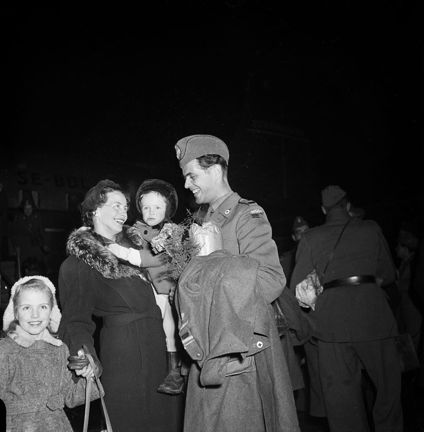 Bromma flygplats. 48 Röda korset-arbetare välkomnas hem, efter sex månaders tjänstgöring i Korea, där väpnad konflikt pågår. Major Gunnar Nyby möts av sin fru Karin och barnen Viveta och Magnus