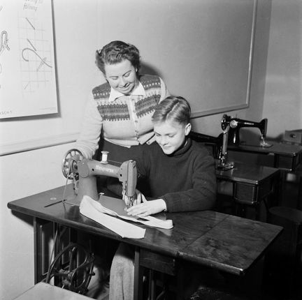 Blackebergsvägen 331. Syslöjd i Blackebergs samrealskola. Olle Alvarson visar för handarbetsfröken Lilian Albe att han kan sy en slips. Under en månad har pojkar och flickor bytt slöjdlektioner