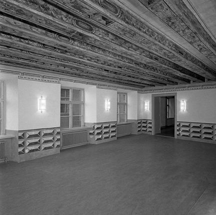 Skeppsbron 24. Vån 1 tr, stora salen med dekorerat bjälktak