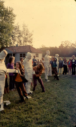 Här leks Mumieleken - den utsedde lindas in i toalettpapper, allt ska täckas. Leken hölls utanför lekstugan vid Ottos minne, numer är lekstugan flyttad till Sörgården.