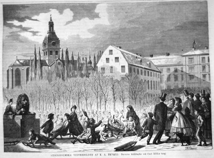 Stockholmska vinterbilder af K. A. Ekvall: Barnens kälkbacke vid Carl XIII:s torg. Teckning i Ny Illustrerad Tidning, nr 3 den 19 januari 1867