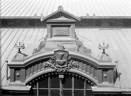 Hötorgshallen före rivningen 1954. Byggnadsdetaljer vid taket med årtalet 1882 då saluhallen byggdes och vapensköld med St. Erik