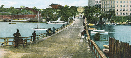 Vykortet föreställer en av alla Liljeholmsbroar som funnits mellan 1660-talet och idag. På andra sidan bron skymtar tullhuset vid Hornstull.