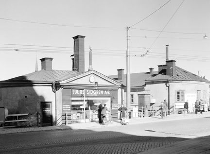 Kv. Järngraven Övra. Julius Sjögren AB järnaffär vid Södermalmstorg 26. T.h. Västra Slussgatan 10. Kvarteret som låg mellan Sjöbergsplan och Södermalmstorg revs 1954