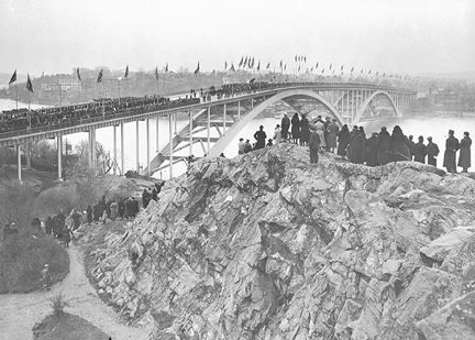 "Västerbron invigdes den 20 november 1935 av konungen. Det blåste snålt och duggregnade till på köpet, men flaggorna smällde friskt i vinden, och 20 000 stockholmare trängdes på sin nya bro, obekymrade om novemberrusket. «Mälardrottningens nya smycke» kallade general Åkerman den i sitt tal, och det var ej blott en tom fras, tyckte man på kvällen när 25 strålkastare riktades mot de silverglänsande bågarna över Riddarfjärden." Citat ur: Lindorm, Per-Erik, Stockholm genom sju sekler (1951), s. 475.