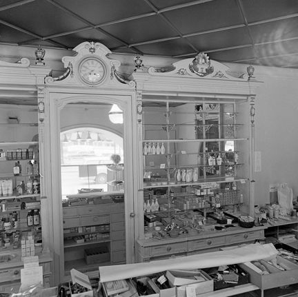 Nordings Parfymeri. Butiksinredning från Hylins butik på Stockholmsutställningen 1897. Snickerier i guld och vitt