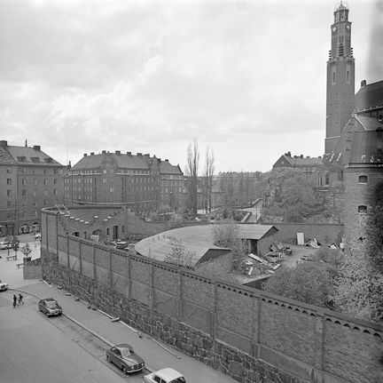 Östermalmsfängelset sett från Rådmansgatan 7. Engelbrektskyrkan i fonden