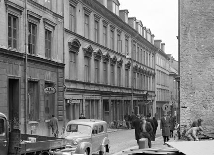 Kv. Stigbygeln, Mäster Samuelsgatan 41-45, västerut. Här ligger nu femte höghuset. Rivningsarbete för tunnelbanans framdragning har påbörjats i kv. Faunen, Mäster Samuelsgatan 40-42