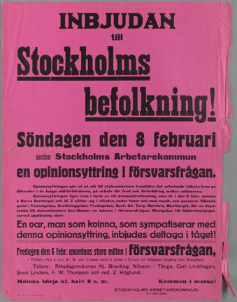 Inbjudan till Stockholms befolkning! [Affisch om motdemonstration till Bondetåget 1914]