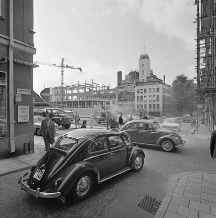 Brunkebergsgatan västerut mot Drottninggatan. Rivning av kv. Hägern Mindre. Kv. Svalan vid Klara Östra Kyrkogata i fonden