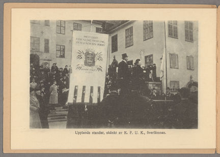 Bondetåget 1914. Upplands standar, skänkt av K.F.U.K., överlämnas.