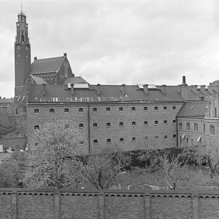 Östermalmsfängelset sett från Rådmansgatan 7. Engelbrektskyrkan i fonden