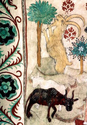 Kalkmåleri av get från Täby kyrka. Under medeltiden var det vanligt med både getter och får i Stockholm.