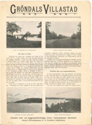 I denna broschyr från 1898 vill Gröndals Tomt- och Byggnadsaktiebolag locka köpare till avstyckade villatomter i Gröndal. I boken Stockholm utanför tullarna kan man läsa följande om Gröndals villastad: "Det 1898 nybildade Gröndals Tomt- och Byggnadsaktiebolag inköpte Gröndals gård med ägor samma år och marken styckades av till villatomter. Det var tänkt som ett mönstersamhälle med ordnad stadsplan för ’såväl affärsmannen, fabrikanten och hantverkaren som för den skötsamme arbetaren’. Resultatet blev ett annat med en mer spontan utbyggnad längs Gröndalsvägen och upp på Ormberget. Det blev i första hand arbetare och hantverkare som byggde de s.k. hyresvillorna, vilka innehöll flera små lägenheter på ett och två rum och kök, där en lägenhet beboddes av ägaren och resten hyrdes ut för att finansiera bygget. /…/ År 1913 omfattade villastaden ett hundratal villor. Idag finns bara ett mindre antal kvar.” Källa: Stockholm utanför tullarna : nittiosju stadsdelar i ytterstaden. Stockholm, 2003. Sid 104. Artikelförfattare: Elisabet Wannberg Broschyren är 4 sidor lång, och illustrerad med fotografier och karta. Se också annonsen från Dagens nyheter den 1:a juni 1901 – där bolaget gör reklam för sina tomter.
