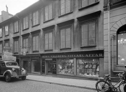 Mäster Samuelsgatan 40. Hulda Hallbergs Vitvaruaffär. Här går numera Sveavägen norrut från Sergels Torg