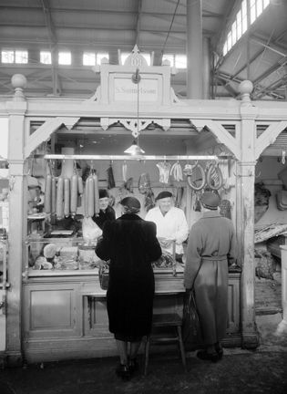 Hötorgshallen. Kunder vid S. Samuelssons köttbutik i saluhallen
