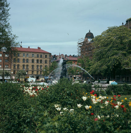 Blommande tulpaner på Mariatorget. Vy mot husen vid Hornsgatan