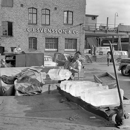 Transporter till Centralsaluhallen. Isblock lastas.