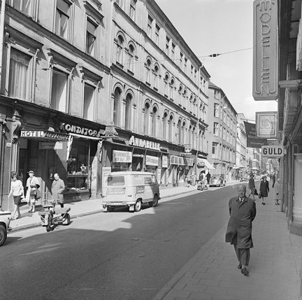 Drottninggatan norrut från Vattugatan. T.v. Drottninggatan 29, kv. Hägern Mindre