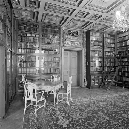 Grev Turegatan 12. Restaurant Tattersall. Byggnadsdetaljer i biblioteket