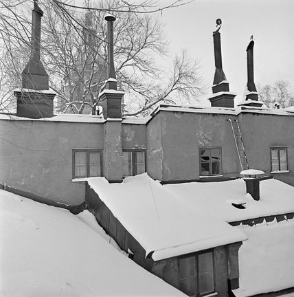 Katarina Östra Kyrkogårdsgränd och Mäster Mikaels Gata 2. Västra längans gårdsfasad med Katarina kyrka i fonden