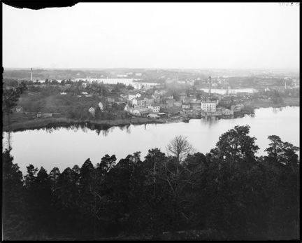 Panorama från Nybohovsberget med sjön Trekanten nedanför och industriområdet Nynäs vid sjöstranden