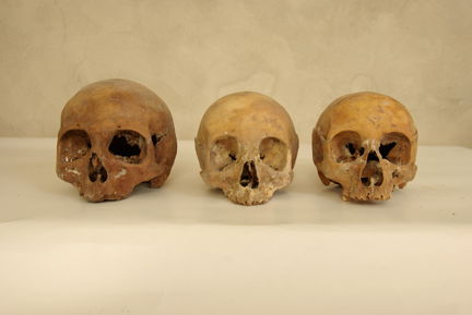 Bilden föreställer tre av kranierna från det som antogs vara kung Magnus Ladulås grav i Riddarholmskyrkan.